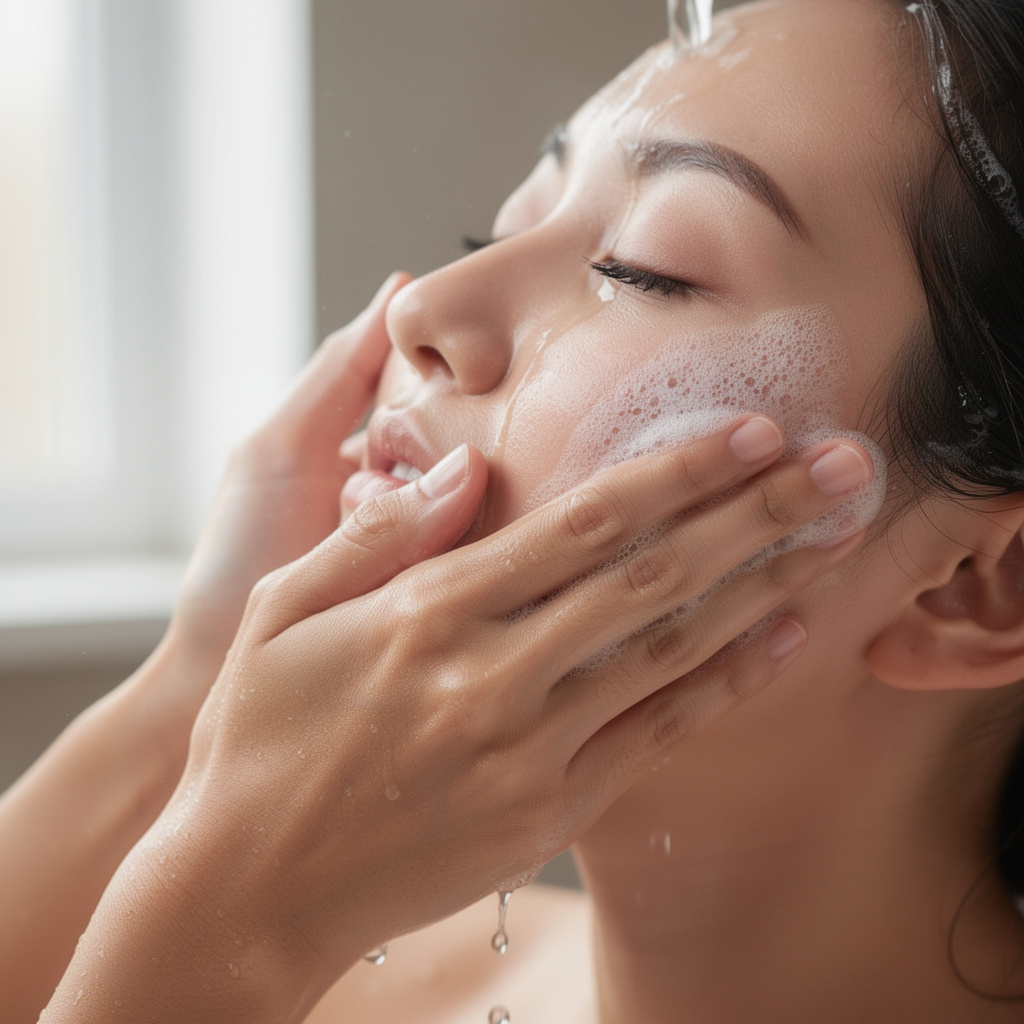 Woman washing face with gentle cleanser in bathroom, hands applying facial wash with water, clean natural beauty routine, bright and fresh atmosphere